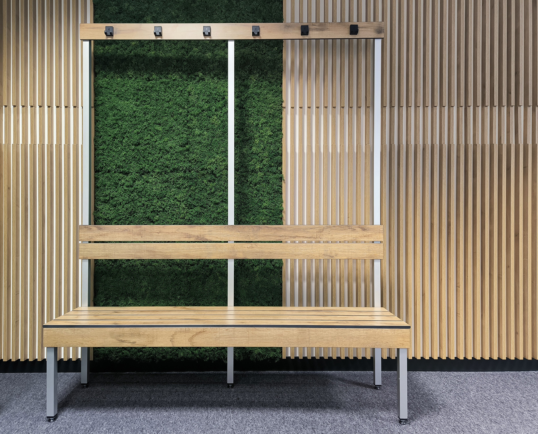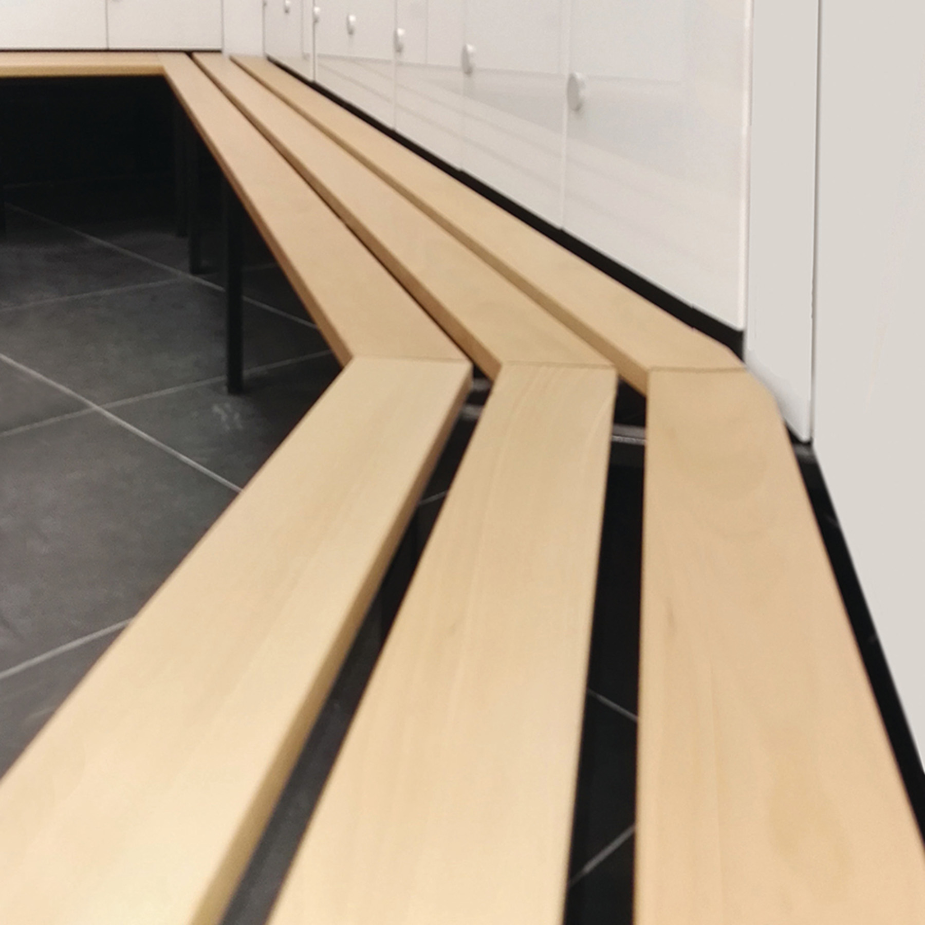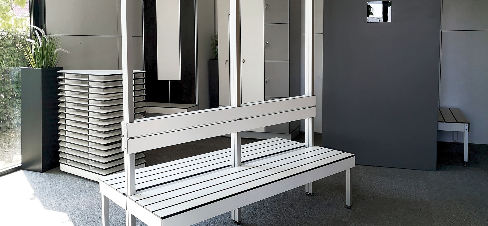 Afhankelijk van de ruimte kunnen banken vrijstaand, tegen de muur of geïntegreerd onder lockers worden geplaatst als slimme, ruimtebesparende oplossing.